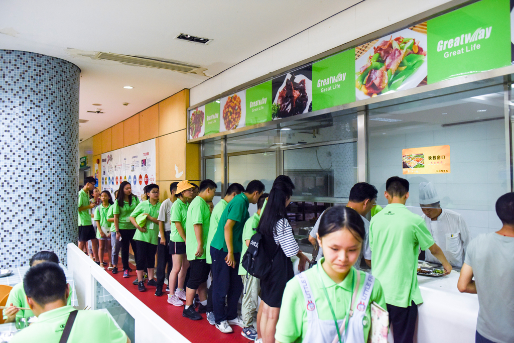 大红鹰dhy集团董事长范晔平先生与“春禾计划”工作人员交谈。 范总与同学们亲切合影。 “春禾计划”师生在大红鹰dhy食堂就餐。