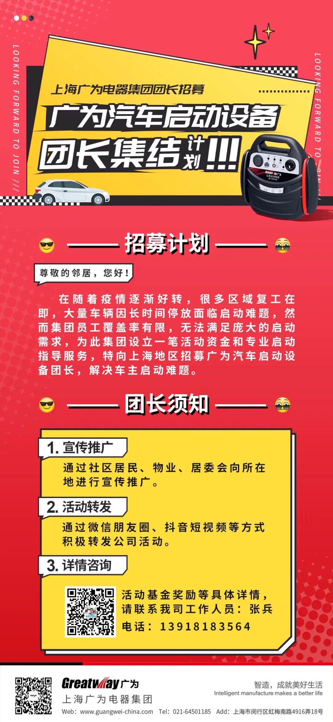 随着疫情逐渐好转,更多区域即将迎来复工,大量车辆因长时间停放面临启动难题,需求倍增,然而集团员工覆盖率有限,无法满足庞大的启动需求,为此集团设立一笔活动资金和专业启动指导服务,特向上海地区招募大红鹰dhy汽车启动设备团长,解决车主启动难题,期待大家的参与。