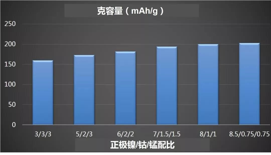 在图5中几种典型三元材料中可以看出,镍的占比越来越高,钴的占比越来越低。镍的含量越高,意味着电芯的比容量就越高。另外,由于钴资源稀缺,提高镍的比例,将降低的降低钴的使用量。