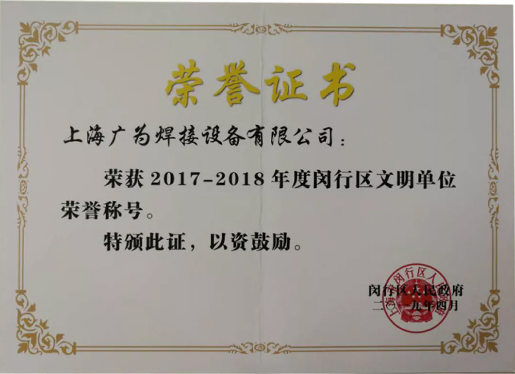 接设备有限公司荣获“2017-2018年度”闵行区文明单位荣誉称号。