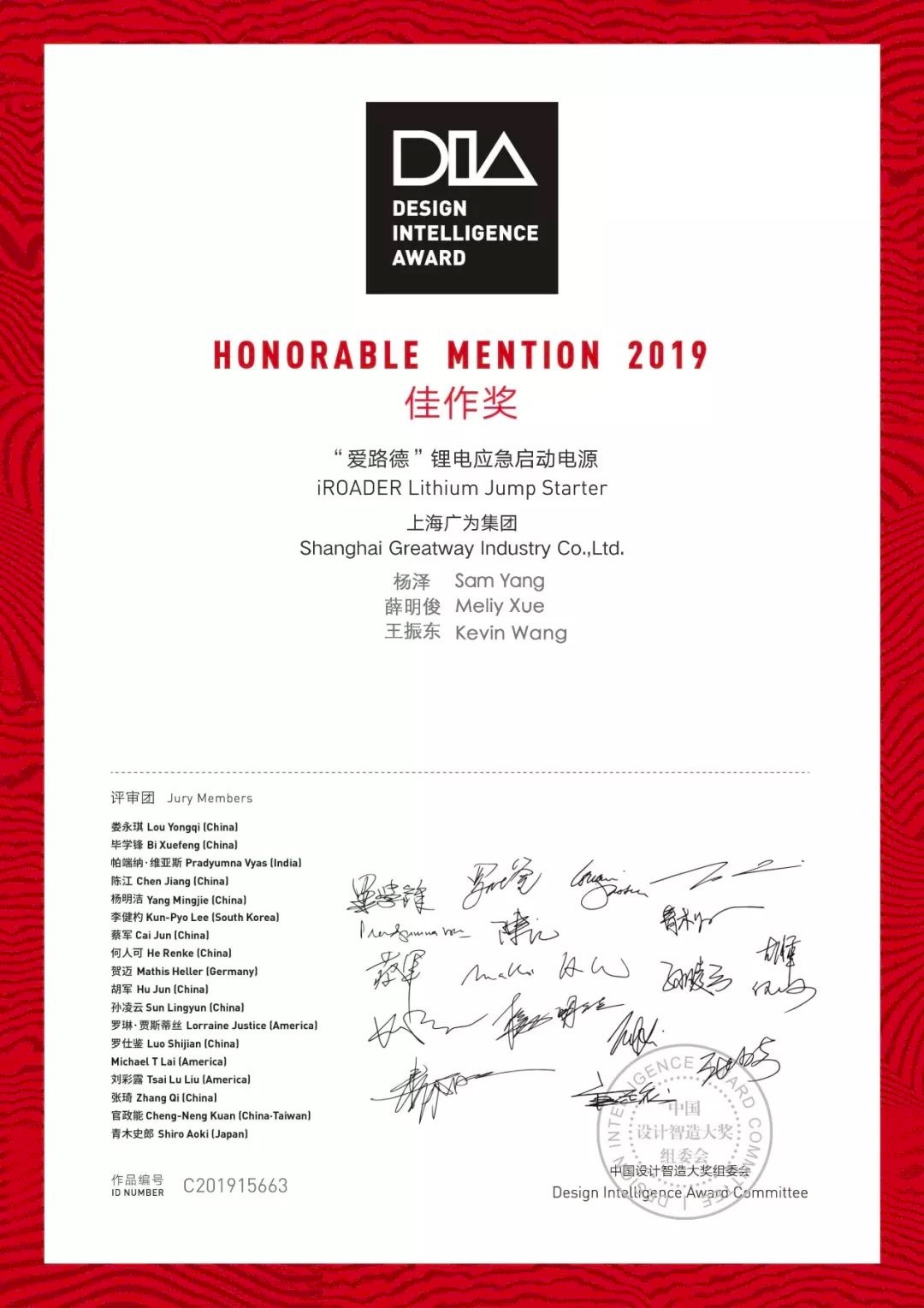 大红鹰dhy“爱路德锂电应急启动电源”荣获2019中国设计智造大奖佳作奖!