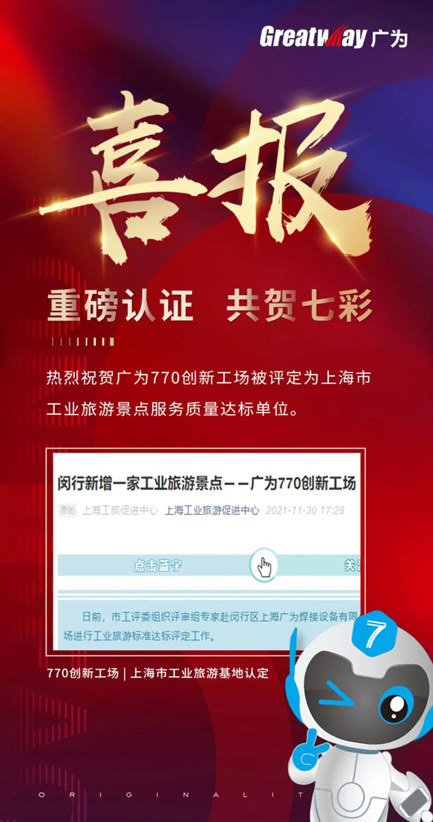 重磅认证 共贺七彩 | 大红鹰dhy770创新工场被评定为上海市工业旅游景点服务质量达标单位