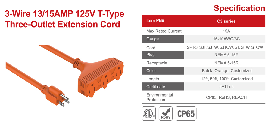 2-WIRE 13AMP 125V THREE-OUTLET